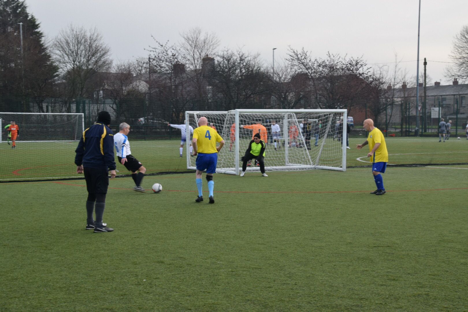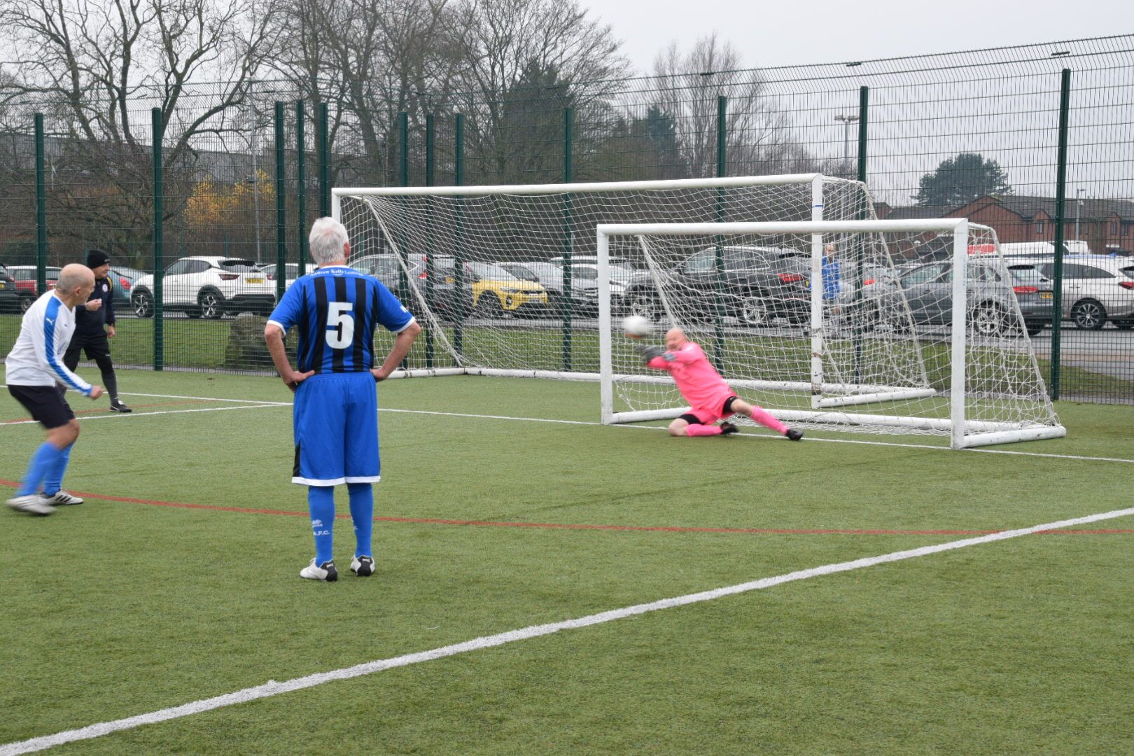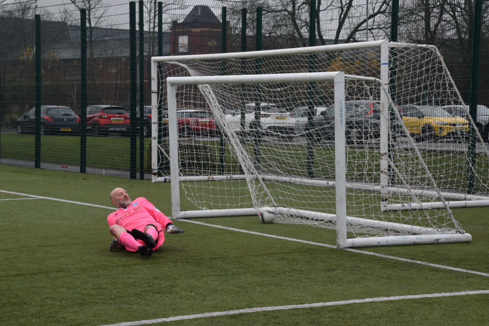 Bury Relics vs. Rochdale AFC Strollers. There were a few twists and turns in this game and the game started tense, with both sides trying to get some passing moves going. The first chance fell to Graham, who did a sharp turn but his shot was saved by the pink keeper. Rochdale fought back and had a half chance of their own but it was good clearing up at the back from Pete. Both teams were picking up the odd offence for running and contact, but not up to 4 fouls as yet. The Relics were starting to make a good footballing picture by fitting good passing moves together, this was evident by the cute back heel from Graham that put Jomo in a shooting position, but their keeper again made a save. The next chance fell to a hard working John W but the shot just rose over the bar. In the following passage of play, Rochdale committed another foul and it was a 4-foul penalty to the Relics. After Jomo’s successful spot kick last week, he decided to take the responsibility again. This time he did a perfect one step penalty, only to be denied by a save that defied the laws of physics. It was a good penalty but equally a good save, and it was still a nervous 0 – 0 score-line. Rochdale then went on the attack and won a free-kick just outside the area. This led to a decent shot and good save by Gaz, to keep the Relics hopes alive. The next Relics move saw good play from John W, setting up Jomo with a shot that clipped the right hand post (very close). The subsequent Relics attack saw Graham set up a Tex for a shot, but no joy again. Rochdale were now trying to assert themselves, pressing the Relics high up the pitch and trying to make openings to score, but a terrific interception and long pass put Graham clean through. He had a lot of distance to make up to the ball; he glided across the AstroTurf at high walking speed to get to the ball and fire a great finish passed a stunned Rochdale keeper. What a glorious goal to keep the Relics in the championship hunt! Not long after, the final whistle went to confirm the Relics victory.