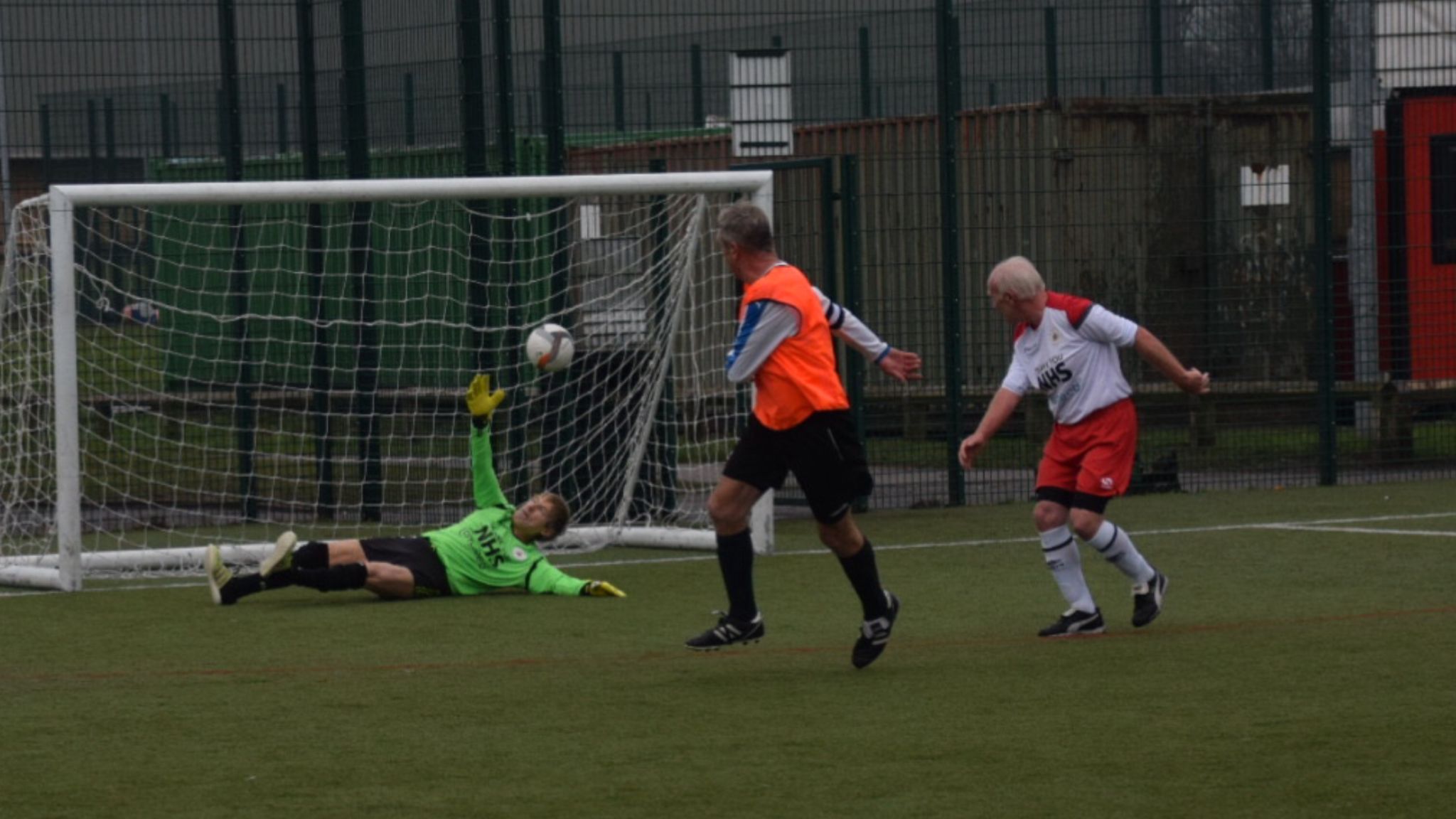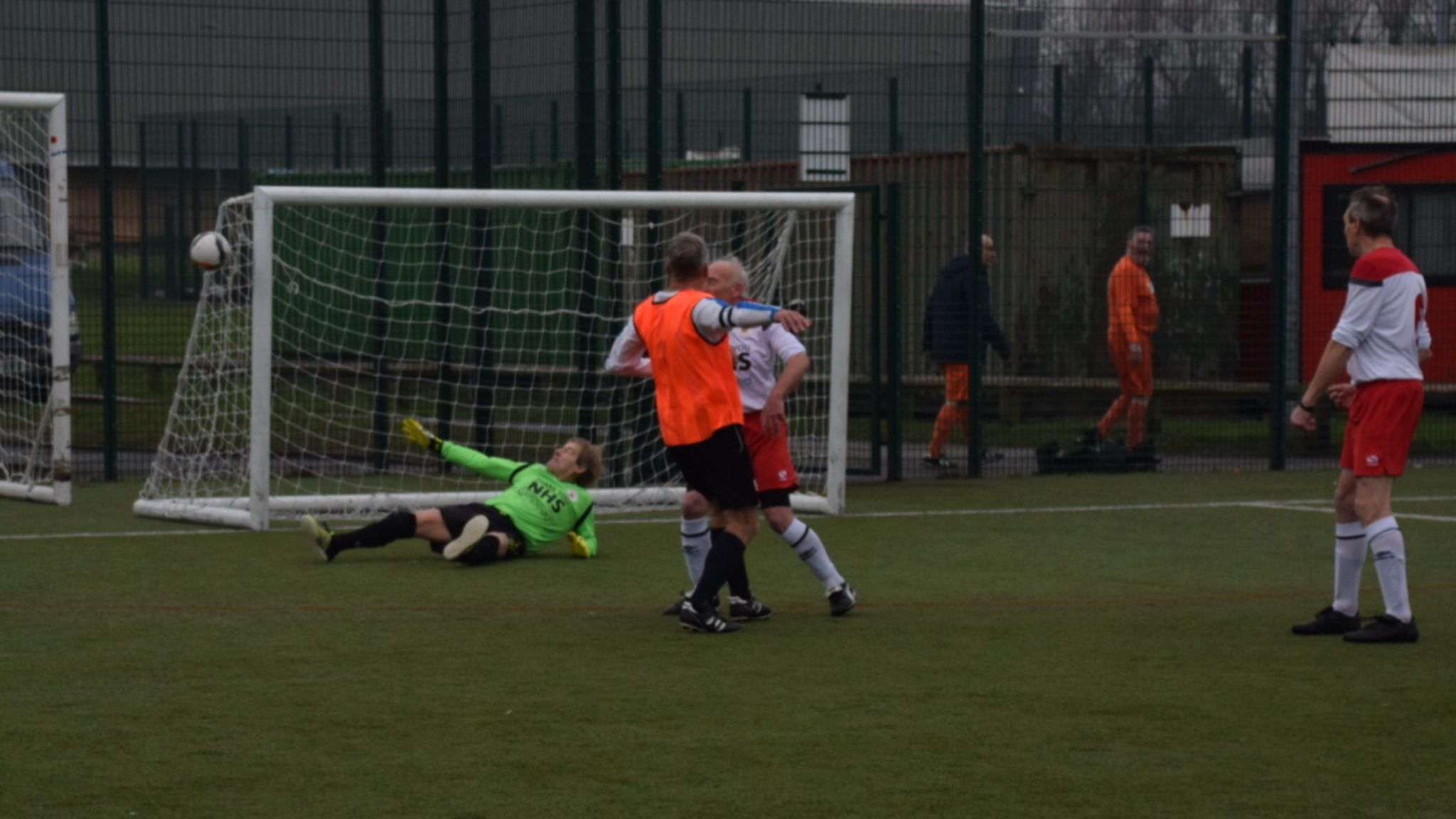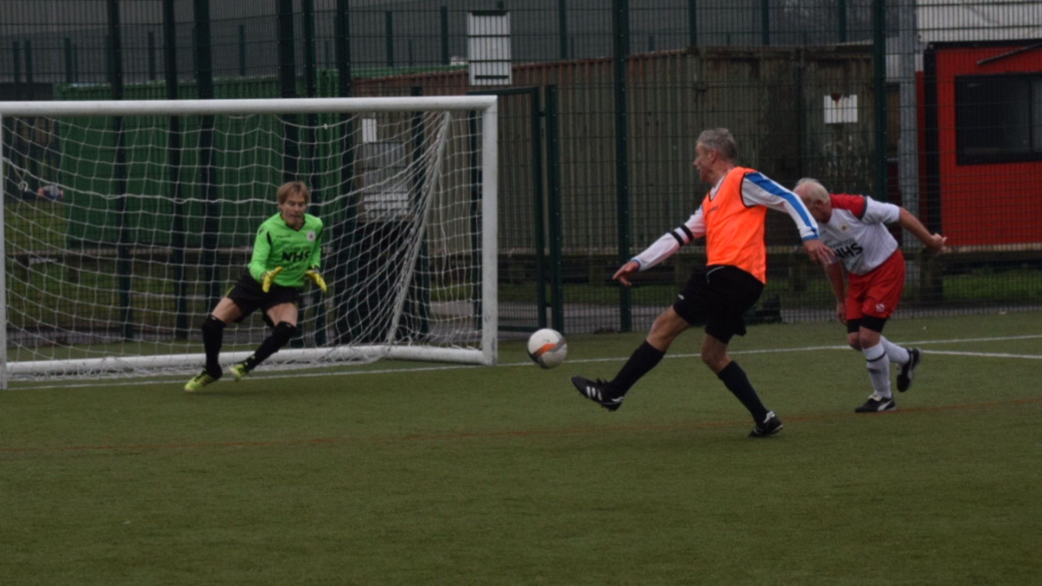 Bury Relics vs. Rochdale AFC Strollers. There were a few twists and turns in this game and the game started tense, with both sides trying to get some passing moves going. The first chance fell to Graham, who did a sharp turn but his shot was saved by the pink keeper. Rochdale fought back and had a half chance of their own but it was good clearing up at the back from Pete. Both teams were picking up the odd offence for running and contact, but not up to 4 fouls as yet. The Relics were starting to make a good footballing picture by fitting good passing moves together, this was evident by the cute back heel from Graham that put Jomo in a shooting position, but their keeper again made a save. The next chance fell to a hard working John W but the shot just rose over the bar. In the following passage of play, Rochdale committed another foul and it was a 4-foul penalty to the Relics. After Jomo’s successful spot kick last week, he decided to take the responsibility again. This time he did a perfect one step penalty, only to be denied by a save that defied the laws of physics. It was a good penalty but equally a good save, and it was still a nervous 0 – 0 score-line. Rochdale then went on the attack and won a free-kick just outside the area. This led to a decent shot and good save by Gaz, to keep the Relics hopes alive. The next Relics move saw good play from John W, setting up Jomo with a shot that clipped the right hand post (very close). The subsequent Relics attack saw Graham set up a Tex for a shot, but no joy again. Rochdale were now trying to assert themselves, pressing the Relics high up the pitch and trying to make openings to score, but a terrific interception and long pass put Graham clean through. He had a lot of distance to make up to the ball; he glided across the AstroTurf at high walking speed to get to the ball and fire a great finish passed a stunned Rochdale keeper. What a glorious goal to keep the Relics in the championship hunt! Not long after, the final whistle went to confirm the Relics victory.