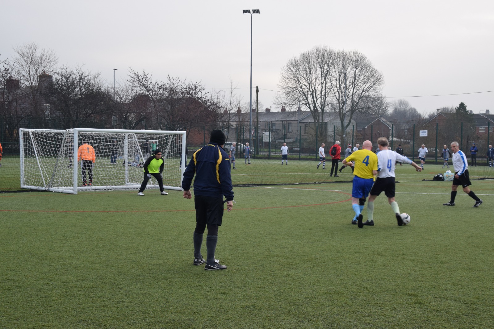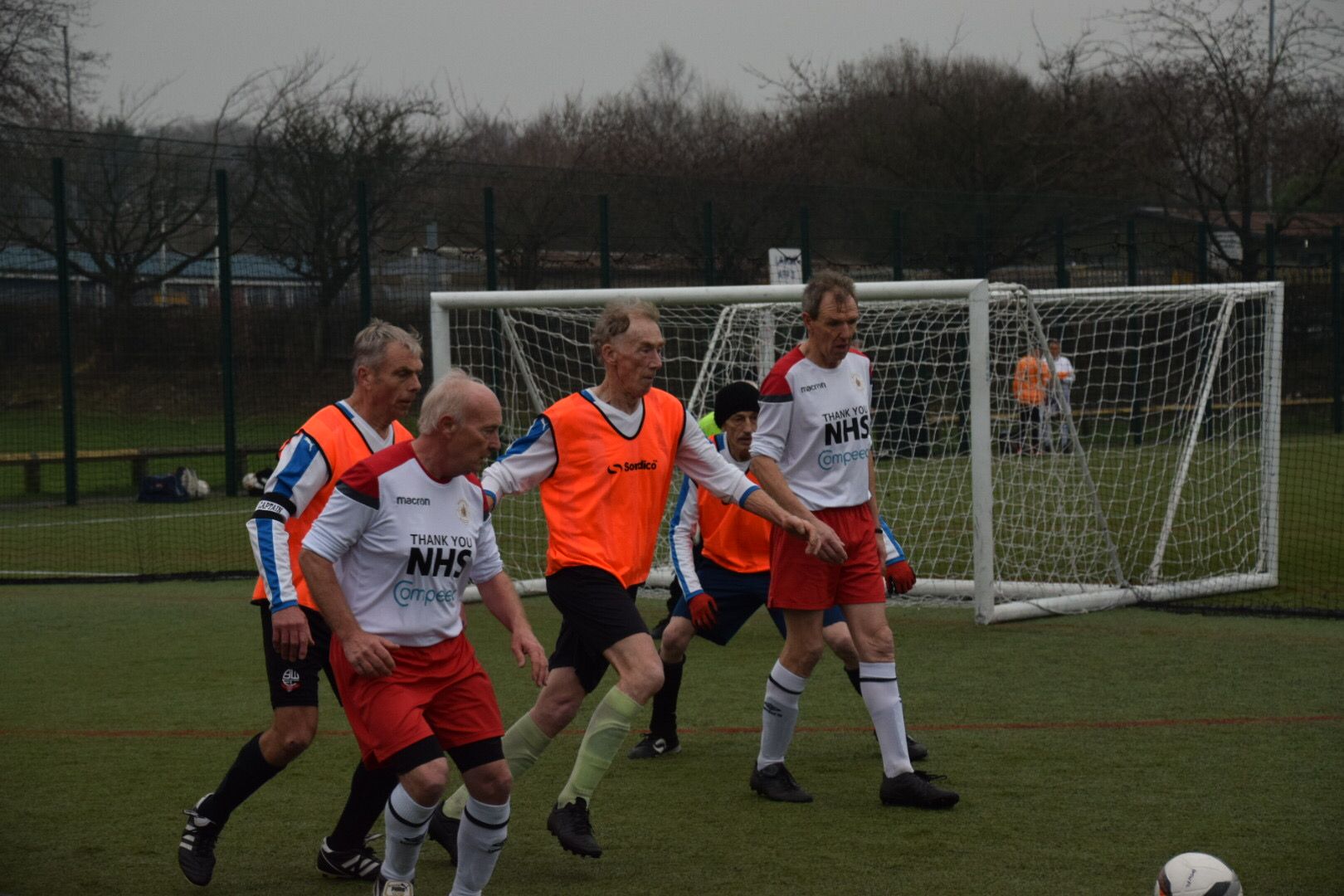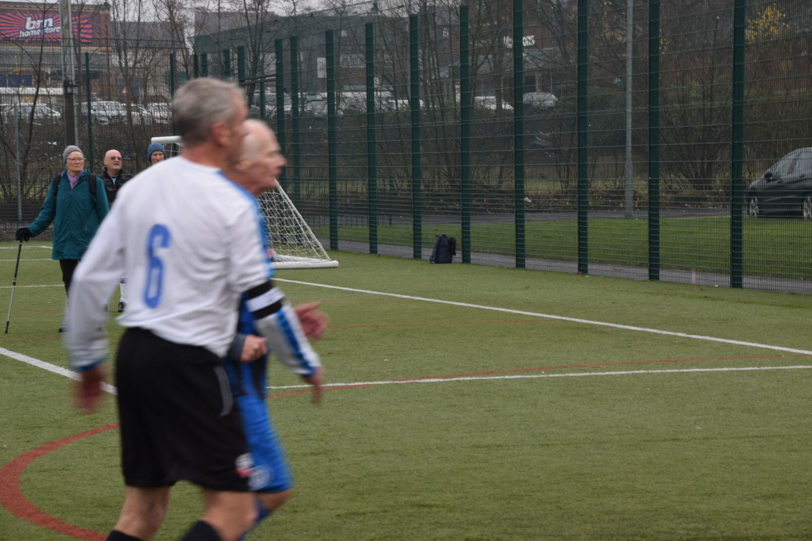 Bury Relics vs. Manchester Senior Citizens 65s. Bury played an excellent game here with precise and crisp passing and some great goals. The first started from a Bob tackle, where the ball was passed around to John W, who found Jomo in space, who then fed the ball to Graham. He took a composed, hard shot past the city keeper, to make it 1 – 0 to the Relics. City were doing some good passing moves now but were not putting pressure on the Relics goal. An interception by the Relics led to a multiple pass move that ended with John W in space to the left of the goal; he fired a cracking shot over the keepers shoulder and into the net for 2 – 0 to the Relics. Great stuff. In the next Relics attacks, Graham got into his groove by twice receiving the ball, with his back to goal, swivelling and shooting. Neither led to a goal but the second was hard, high and over, which smashed the fence so hard, it scared the birds away. A bit of a tussle was developing in midfield and as the ball was hit to the left, Bob was favourite to gain possession. However, Bob was completely cleaned out by a sliding tackle that started 10 yards away. The ref was quick to hand out a Blue card, seeing the City player leave the pitch. Relics made the extra man count by passing around the team, which put Jomo through, only to see his shot saved. Again, Relics created another chance, this time for John W, who shot just wide while through on goal. The game was in its last ebbs, when a chance was created for Bob, who took a left foot shot, that looked like he stubbed his toe, and unfortunately did not trouble City’s keeper. It caused Bob more trouble as he was now in a bit of discomfort. The game ended 2 – 0 to the Relics and the dream of glory was still alive.