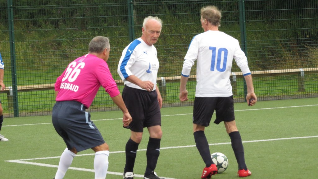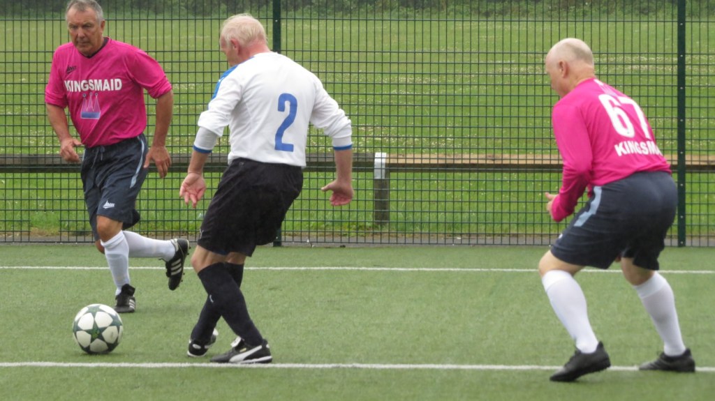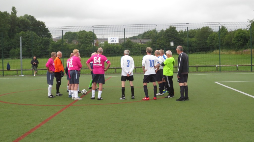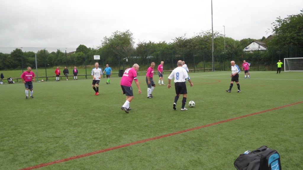 What a fabulous occasion for the Bury Relics over 65’s team? Following a solid spring league season, where they finished runners up, the team had also reached the final of the Pharmacy2u cup. The run to the final was impressive, with wins over Winstanley and Oakwood, with Relics producing some great football in both games. Now it was the final, and a sizeable group of Bury Relics staff and fans had turned out to watch. Before the game, Ken and Pat the Cat were putting the team through a typical Friday morning training session warm up, that also included some passing and ball control practice. Meanwhile, Keiren was warming the hands and preparing Gaz the keeper for the match. Not to disappoint anyone, the usual Heywood inclement weather had not let us down, and had turned up with the usual clouds and rain. No road-work hindrance was experienced getting to the game. Bury Relics were in the White kit, and Kingsmaid were in a purple colour.