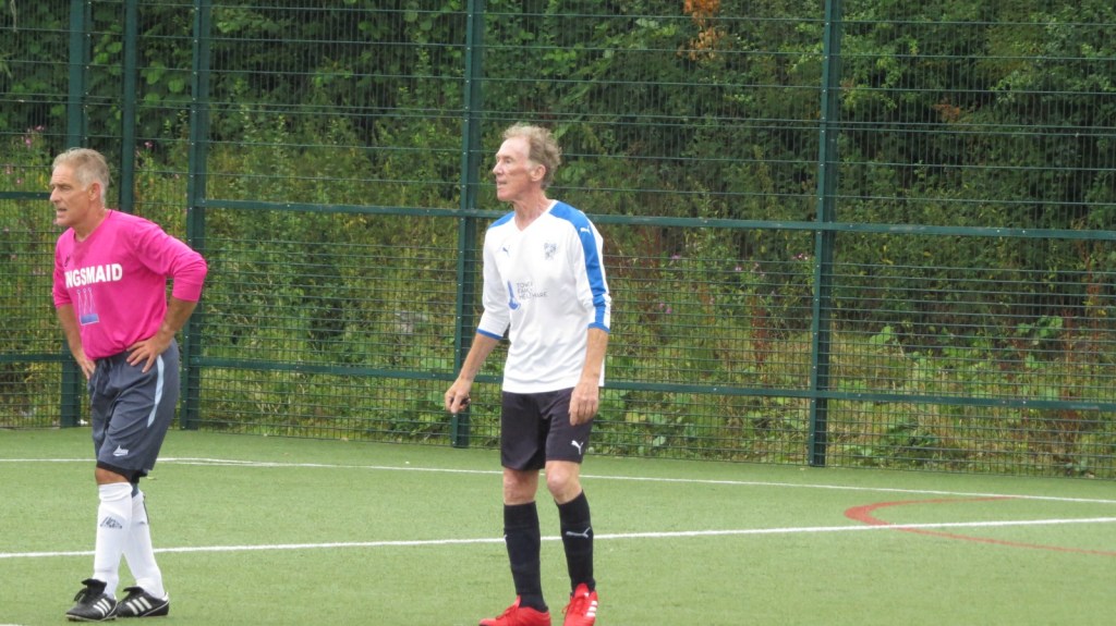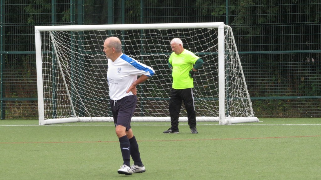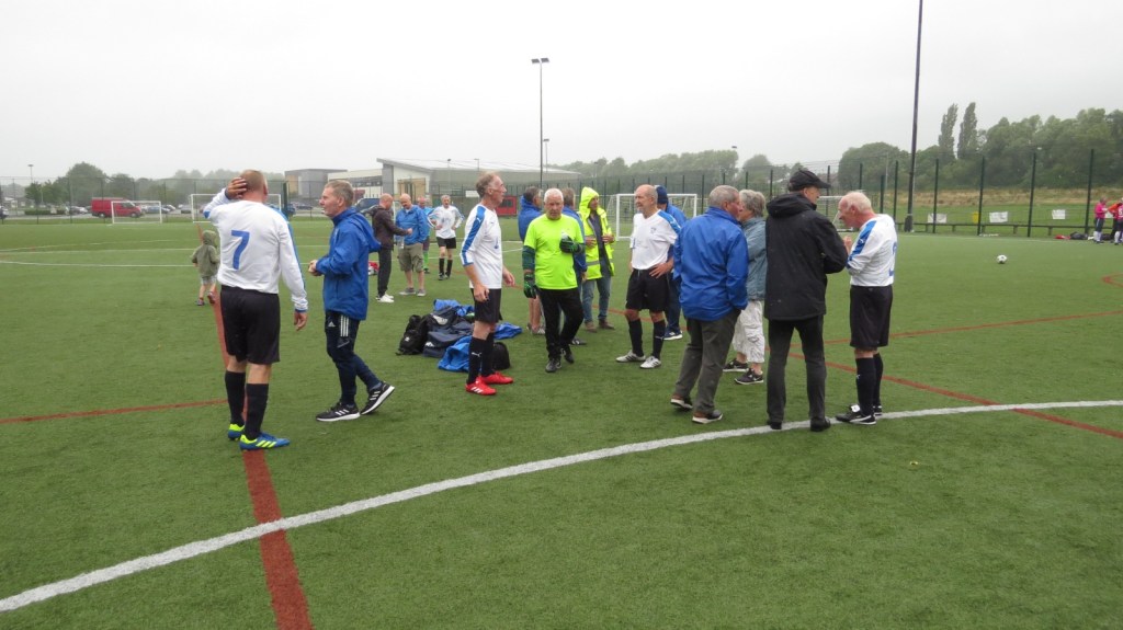 Bury’s first attack of the second half, saw Tex play a great pass down the righthand side, which found Stewart free. His shot was powerful, low and on target but the keeper was equal to it. Soon after, Kingsmaid put the ball out for a Bury kick-in, and John W played a one-two with Stewart. John was quick-thinking and hit a first time shot from Stewart’s return pass; the keeper had to make a full-stretched dive to his left, to save a certain goal. Was a great effort from a long way out. Kingsmaid intercepted from the subsequent Bury corner but and played it forward quickly; however, their #77 was adjudged to have ran when taking on Peter for a shot. The subsequent Bury move ended in a free-kick to Kingsmaid for running. Rain had started pouring down with a harder intensity and Bury made a stray pass that was cut out and played up-front for Kingsmaid. The striker was challenged by 3 Bury players, who got the ball safely to Gaz in goal, but the referee saw an infringement and it was a free-kick to Kingsmaid. Disaster struck from the free-kick, where their tall centre back, #64, took his time before playing the ball to the right-hand side of the area. The striker, #77, moved from the left towards the ball, and in what seemed like slow motion, turned following the movement of the ball, and hit a first time shot on the turn. The ball arrowed straight at the diving Gaz, through his legs and into the net. There was not enough time for Gaz to react and get down to it properly, as the shot was right on the edge of the area. A sucker punch for the Relics who had played well up to now; it was now 1-0 to Kingsmaid. The goal changed to the dynamic of the game; Kingsmaid could relax and take more time in possession, whereas Bury had to press and try and win possession back. Jomo almost played pass of the match in the next Bury attack. The ball had been played around the team, and Tex had seen an opportunity of open space on the right side. Jomo looked up and played a great ball across, but unfortunately a Kingsmaid leg managed to get a foot on it. Bury were pressing well now and forcing Kingsmaid into mistakes, where Stewart produced a smart turn and shot, that was just wide of the lefthand post. A 10-pass move from Kingsmaid followed, with passes both forward and back, trying to manage the game. Jomo managed to intercept to end this move. Kingsmaid subsequent move lead to a free-kick, which they laid off into midfield, and a shot that went high and wide of Gaz’s goal. Bury piled forward and momentarily lost possession, until Jomo made a great battling challenge. He immediately played the ball forward, where Stewart was lingering, but the ball was closer to the defender, who managed to clear. However, Stewart was committed to the challenge, and ran into the defender, who’s elbow ended up in Stewart’s chest. It was hard to tell if there was any intent from the defender, and Stewart was momentarily down but soon back on his feet, being the warrior he is. Kingsmaid pressed forward from the freekick but lost possession and Relics again tried to find an opening. No luck this time, and Kingsmaid had a breakaway attack following an interception. The Kingsmaid player was running, so no danger. A substitution for Bury was made, with Alan replacing Peter. Alan was straight into the action, by nicely setting up John W for a snap shot, that was saved by their keeper. Both teams made chances but the shots were going wide or over, but this was a prequel to the second sucker punch. Bury were on the attack, when the referee saw a Bury player running. From the resulting freekick, the ball was played to #77, who controlled the ball, turned to face the defender, move the ball to the left, dummy to shoot, before moving the ball further wide of the defender, then shooting to the left, past a stranded keeper. That was 2-0 to Kingsmaid and things were looking bleak for the Relics in rainy conditions. However, the second goal had the effect of super charging the Relics efforts to press Kingsmaid more and to make goal scoring chances. With the Relics on the attack, a misplaced pass gave Kingsmaid possession, and as before, a quick pass was played directly up to #77 up-front. He again used his guile and close foot control to make space for a shot, that was again wide of the outstretched arms of Gaz in goal, to make it 3-0 to Kingsmaid. Bury were not lying down and were going all out for pride, to get at least 1 goal back. The Relics were pressing all the Kingsmaids players, who were trying to manage the game by playing the ball around. They sometimes were taking advantage of the rule, that pass-backs to the goalie are allowed but to be fair, they did not use that too often, and would play it forward if the opportunity was there. Bury continued to toil and press, and eventually their efforts were rewarded by a stout challenge and shot by Stewart, that had such power that, even though it hit the keeper, the spin on the shot took the ball into the net; the Relics fans cheered and it was now 3-1. The game continued with the same pattern but the Relics did not create any clear-cut chances, and it finished with the result of 3-1 to Kingsmaid.