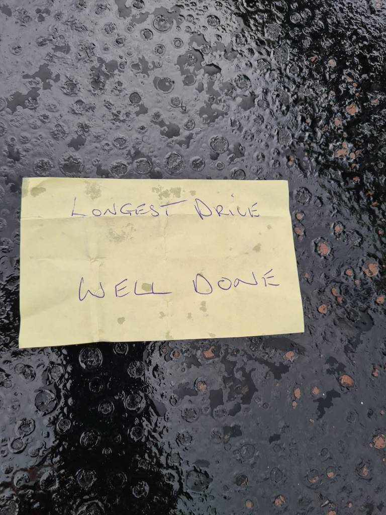 2) Andy R was with the longest drive, who won the coveted yellow parchment trophy, sponsored by post-it-notes (see below) and