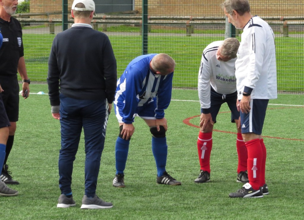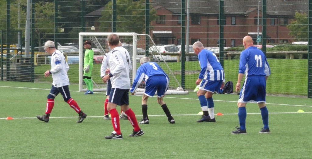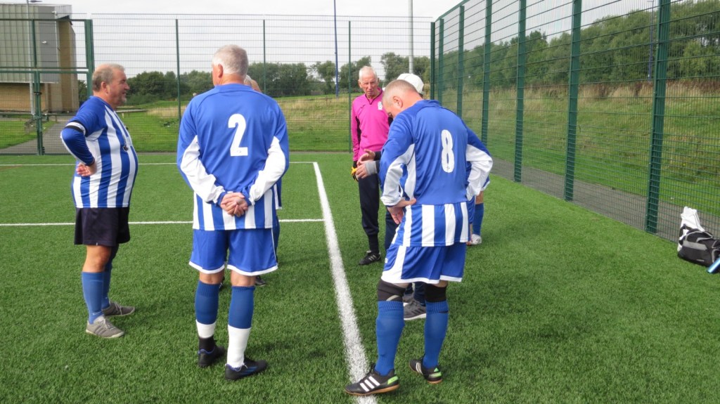 A new season for the Stripes awaited in Heywood. A scratch team was scrambled together, that included the super utility over 70s player in Goal, Bob Cat and the Parkinson’s England team centre forward, Keith B. When I arrived, they were warming up, by performing a “piggy in the middle” type approach, with Mark T running around like a crazy, drunken fly, trying to get the ball as it was passed around a ring of Bury team members. I have to assume the other players had a turn before I arrived. For a change, today had good playing conditions, and after the usual obligatory league speech preceding all league fixtures, Bury Relics got their season underway against Wakefield. As the team marched onto the pitch, the management were giving encouragement and geeing the Bury troops up, with added instruction. One Relics player replied, “will give it a go”; a good sentiment, always try your best. So here we go…