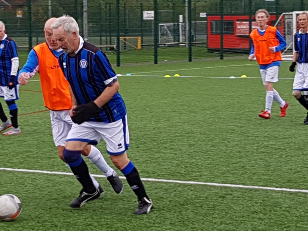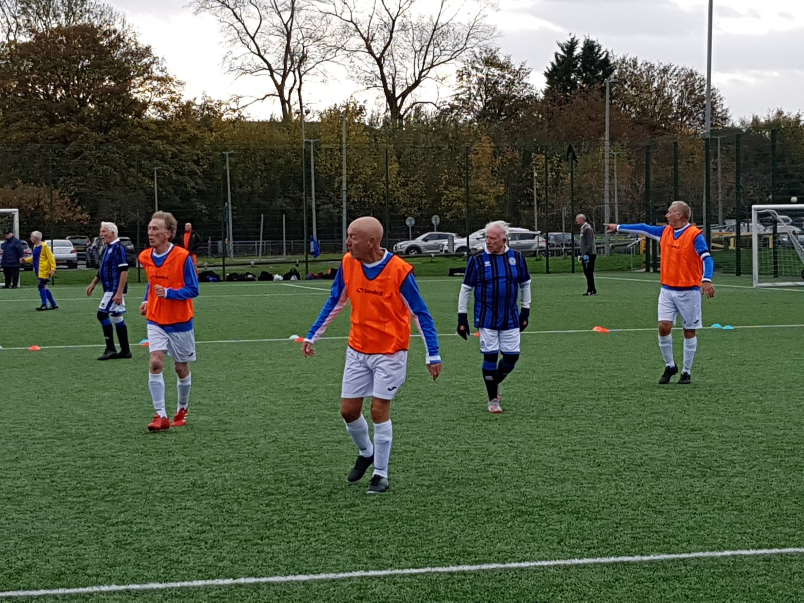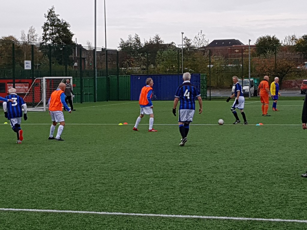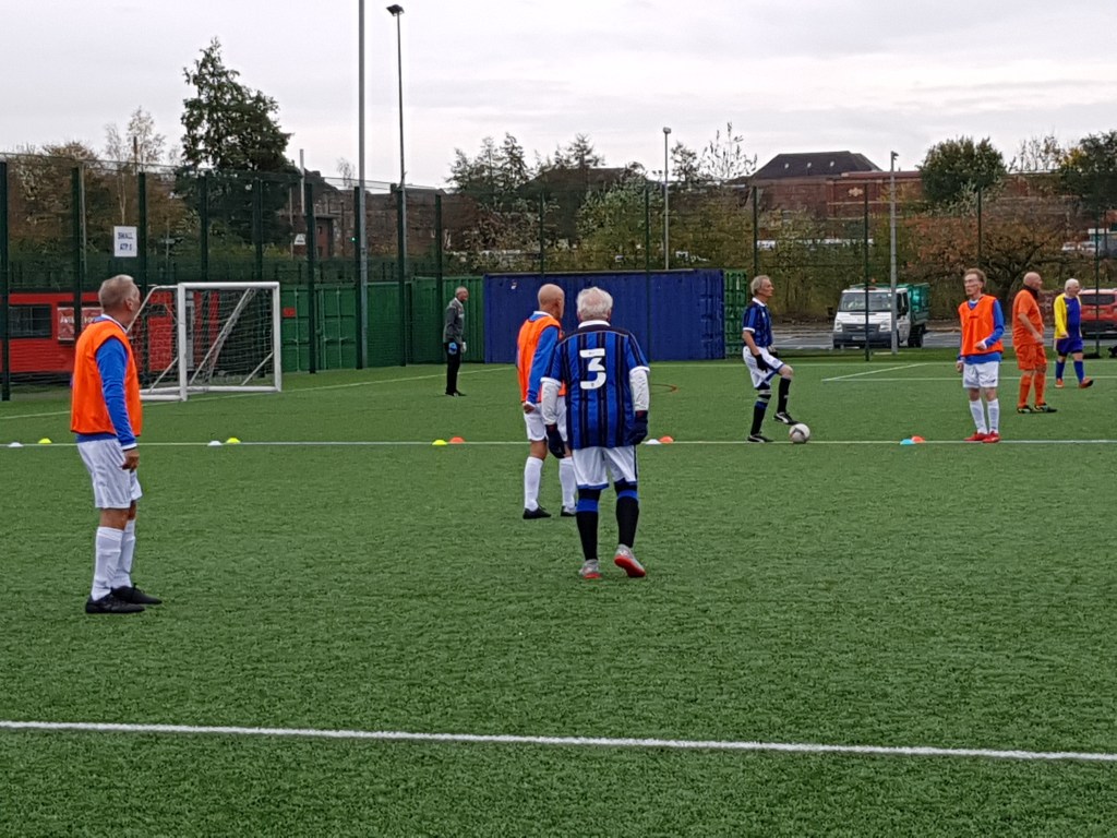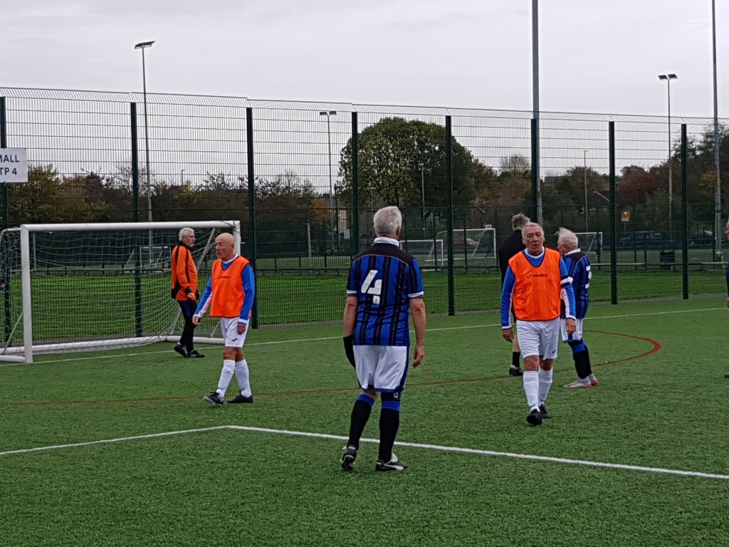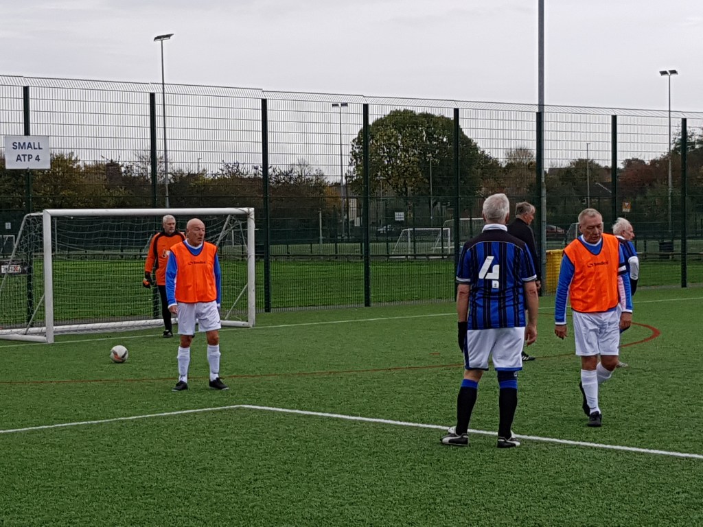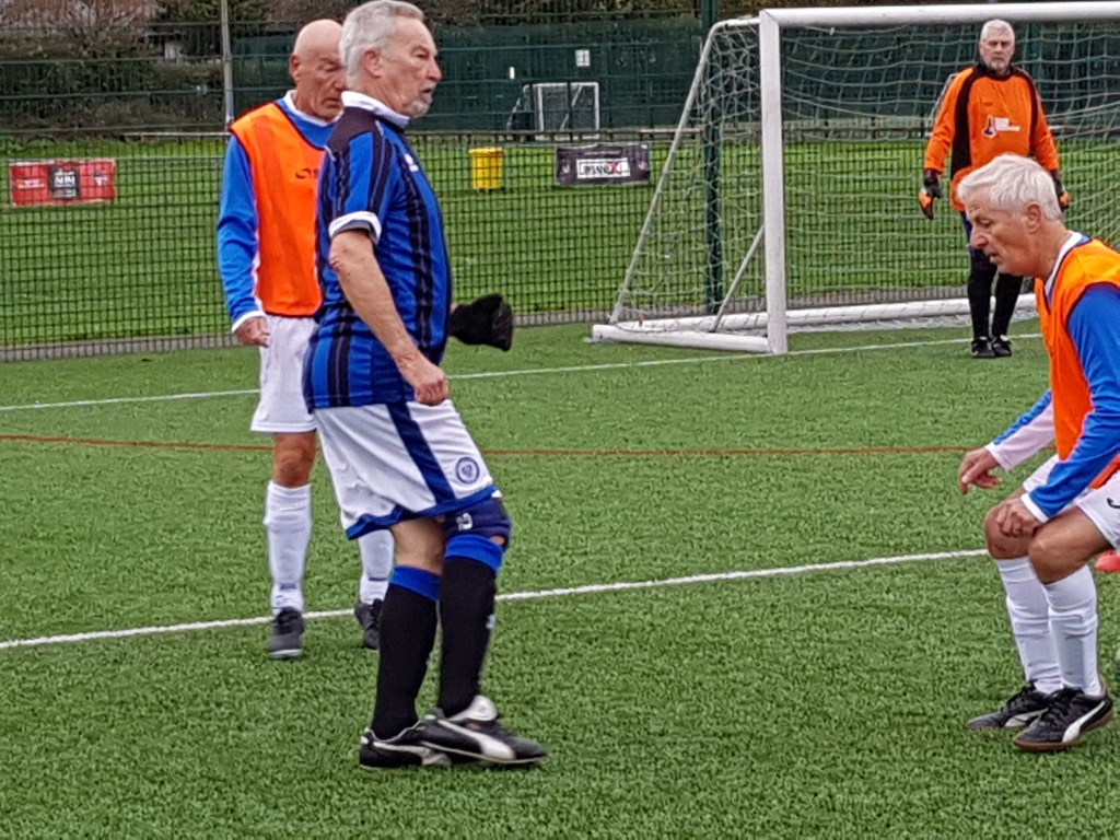 For once, there was no rain to greet us at HeyFlood but a cool 12 Celcius temperature and a medium speed wind. The Bury Relics over 70s squad were ready for action and out in force, with a grand total of 8 players in today’s squad. Following the leagues ritual of going through safety features, Pat had to remove his diamond encrusted ring, as even the bright yellow insulation tape that was encasing it was not deemed safe enough to play with. Minus the Bling, the games commenced.