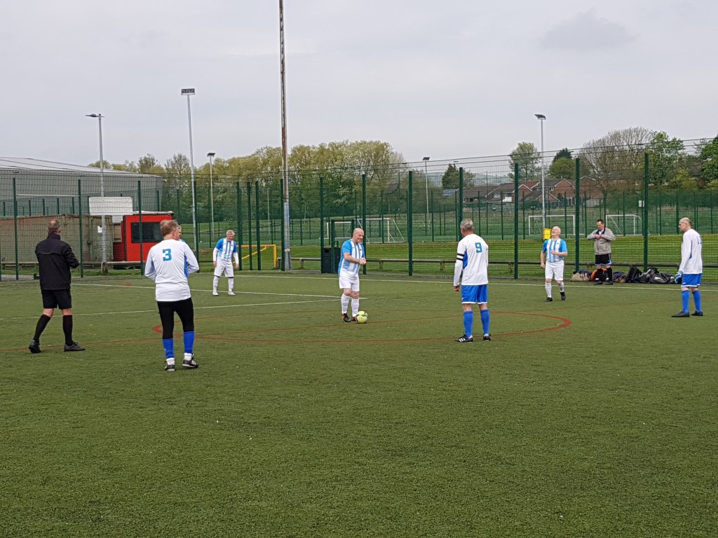 The sun was shining in Heywood, and the phone app said it was only a 25% chance of precipitation, which is very different to the usual 150%. However, there was a slight chilly breeze in the air, which made for perfect playing conditions in terms of keeping cool, but the wind was causing havoc with the netting behind the goals. The league speech before the game stated that there were to be no brews and biscuits for after these games, since it was polling day. Boo, but nobody seemed bothered. Bury were currently sat in second place in the league, wedged between Kingsmaid, who are top (a point ahead), and above Wakefield, who were third due to an inferior goal difference to Bury. The 60s whites had put together a strong team for the day, and around 12 supporters had turned up to see the cream of Manchester play Walking football. First up for the Whites were Kingsmaid.