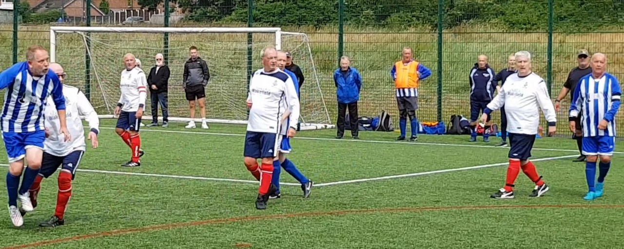 The statistics show that despite finishing bottom of the league, Bury Relics over 60 Stripes are on an upward trajectory; their play has improved over the course of the season, and as a consequence, their results have improved too. Plus, there is a great team spirit around this team and manager, ergo the Stripes are looking forward to next season with optimism. The Bury Relics Stripes squad: Eddy “The Eagle” (GK), Andy R (C), Mark T, Motherwell Ian, Watford Mark, Mike B, Nev K, Fast Ken B and Steve H. Team management and staff: Ken Bug and Sir Pat. Several supporters included David and his grandson. Report by Dr. John.
