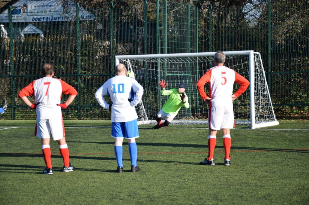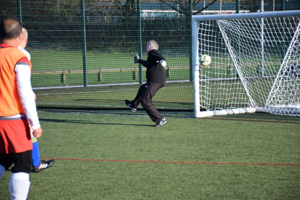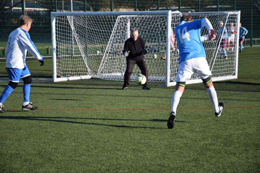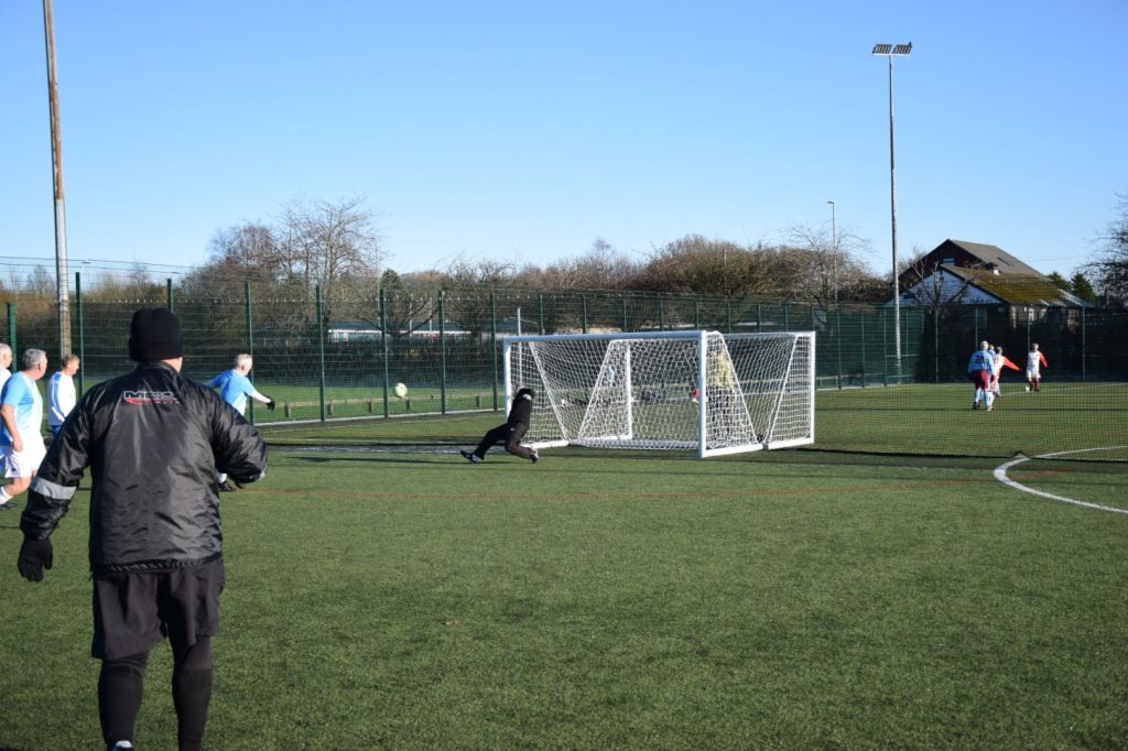 Hats and scarfs needed for today, there was a chill in the air, and one side of the pitches was frozen. Someone else was also ice-cool as he was totally unexpectedly put in goal. The regular keeper was a no show, so Pat bravely volunteered to step at the last moment. Graham, the regular striker, was back from Australia and the rest of the team was packed full of walking football talent. The league table, at the start of play, had Bury third, where only a miracle would give Bury a runners up medal. In contrast, there was a definite possibility of relegation, being only 6 points ahead of last placed Corinthians. Kingsmaid were the first opponents and they were fighting to be champions.