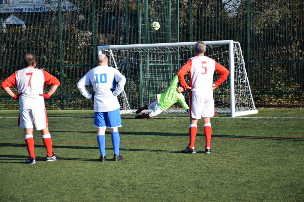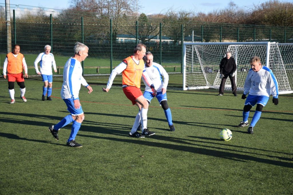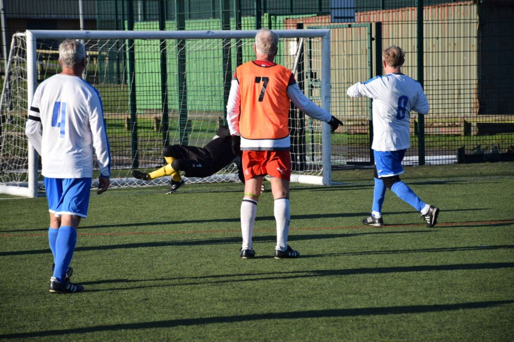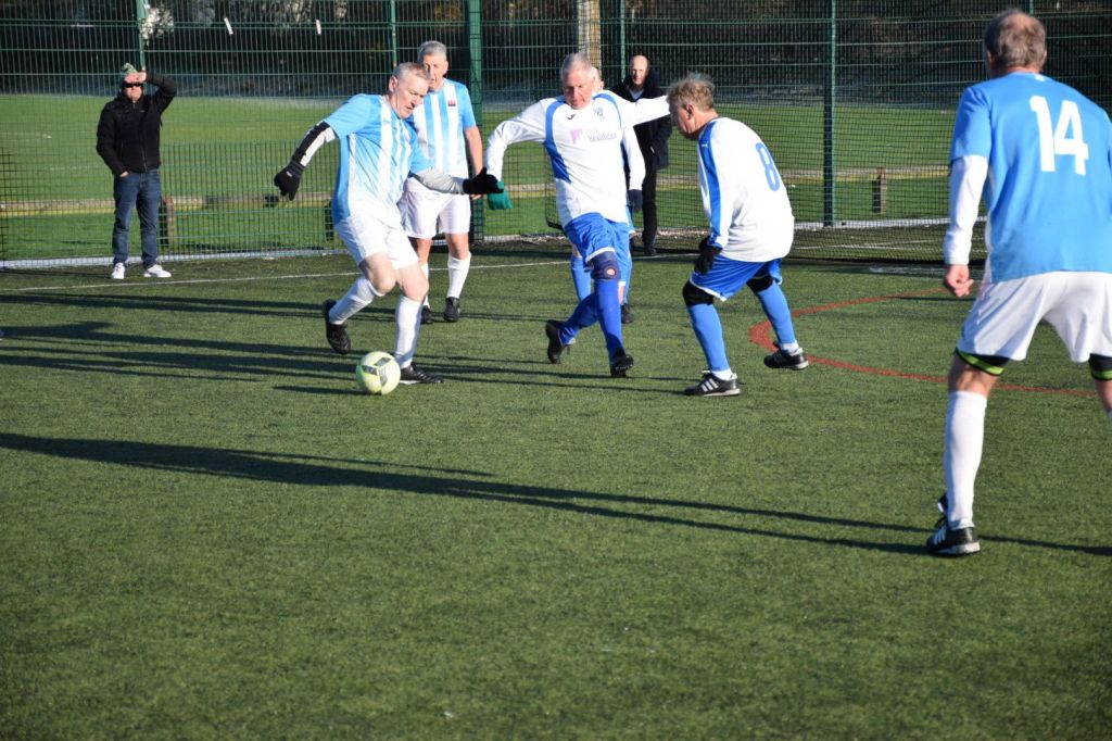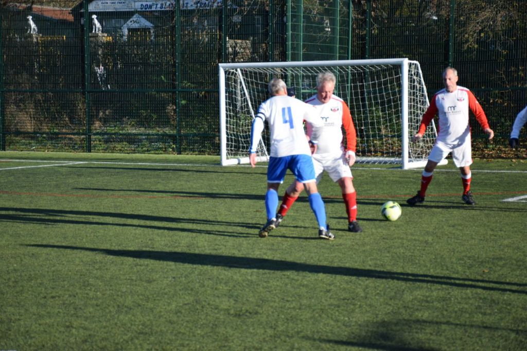 Hats and scarfs needed for today, there was a chill in the air, and one side of the pitches was frozen. Someone else was also ice-cool as he was totally unexpectedly put in goal. The regular keeper was a no show, so Pat bravely volunteered to step at the last moment. Graham, the regular striker, was back from Australia and the rest of the team was packed full of walking football talent. The league table, at the start of play, had Bury third, where only a miracle would give Bury a runners up medal. In contrast, there was a definite possibility of relegation, being only 6 points ahead of last placed Corinthians. Kingsmaid were the first opponents and they were fighting to be champions.