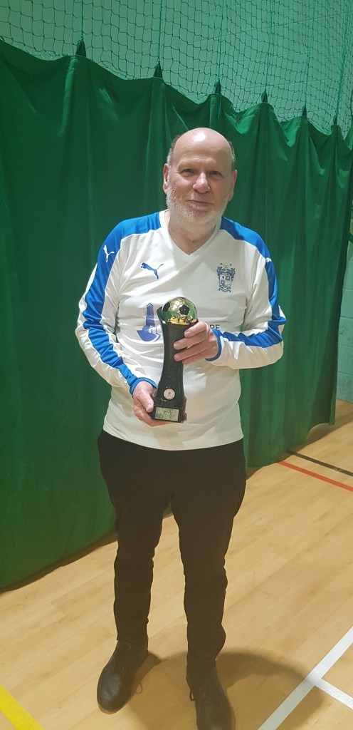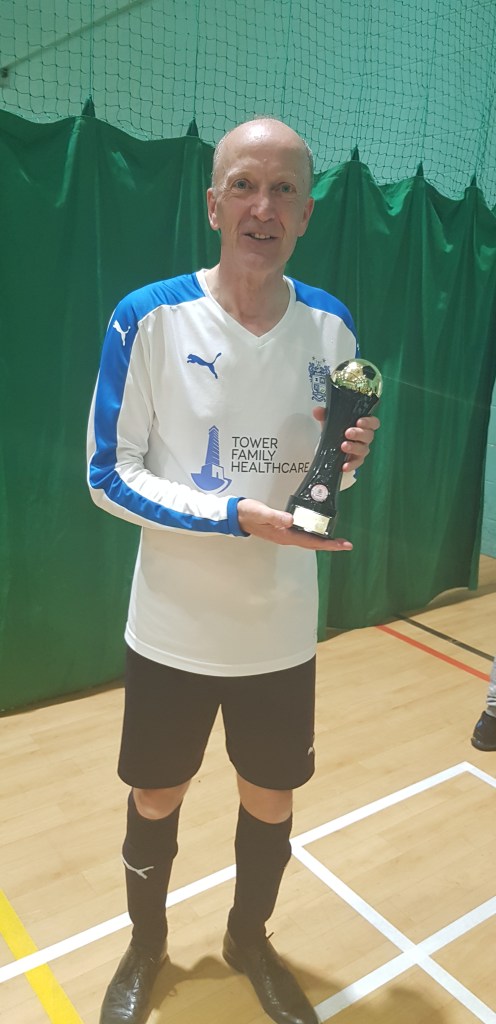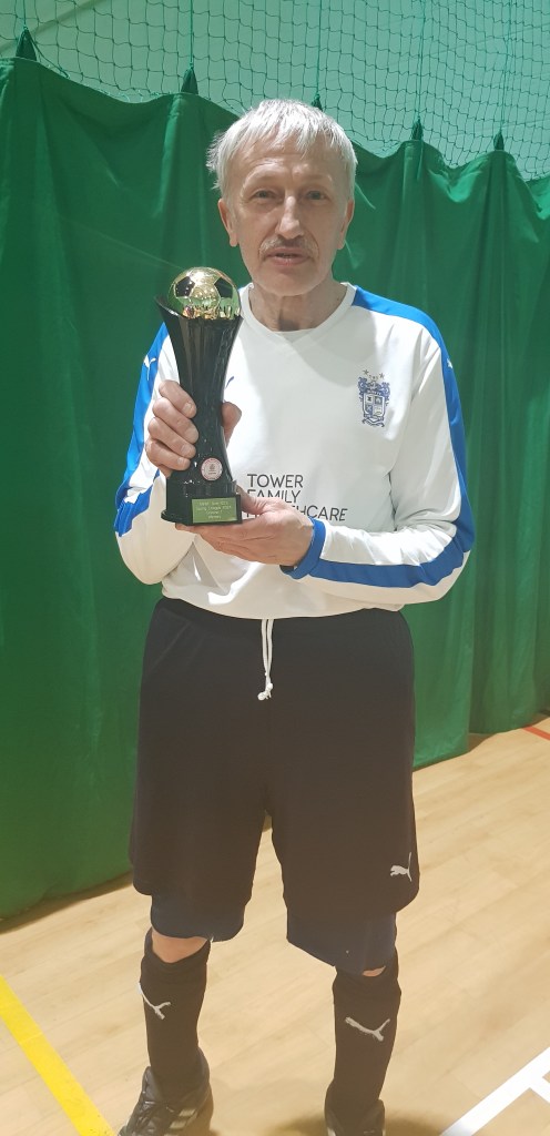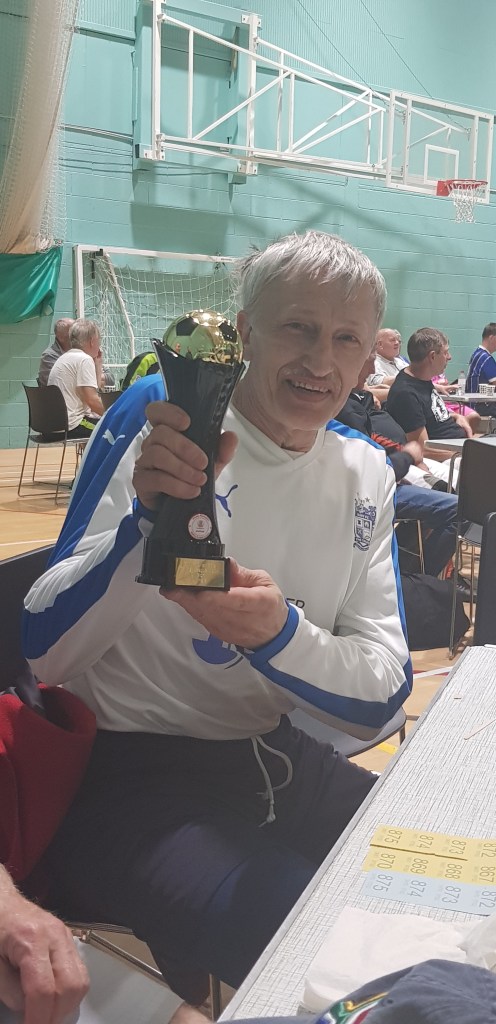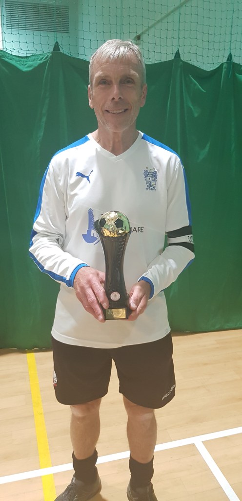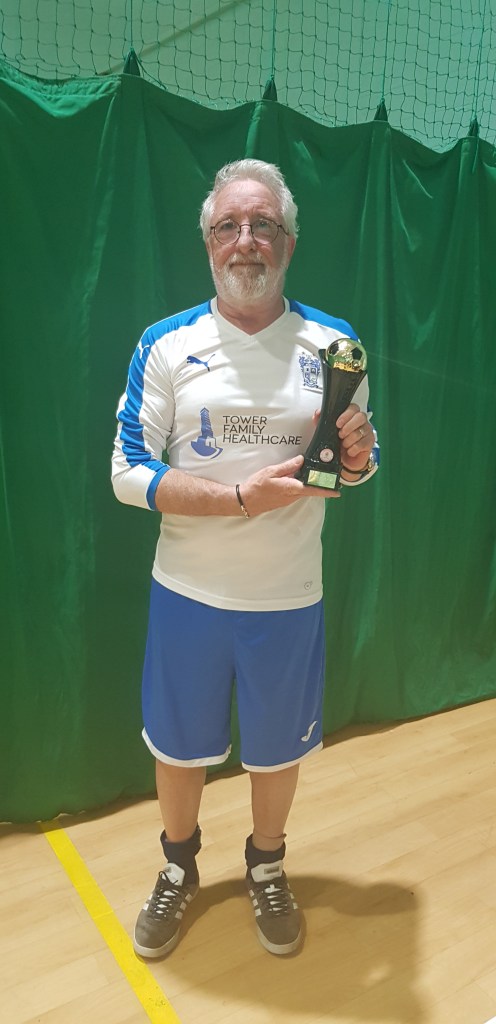 On the day, Bury Relics were the best team, with more attacking play that any of the other sides. Three wins and a draw are almost a clean sweep and that is a championship winning performance. However, Bury probably owe Blackpool a drink or two as they fought for a 1-1 draw for the final game against Wakefield, while Bury were playing Corinthians. As well as Bury played today, they didn’t score against Wakefield and that goal/draw for Blackpool gave Bury the two extra points and the league title. At the final whistle of Bury’s game, most players were happy to think they had finished runners up, but the news got through they were in fact champions. This was one of the happiest moments I have experienced with the Relics, everyone was totally stunned and completely elated when they realized they had won. The Pie and Peas tasted even better and it was fun taking photos of team players holding the trophy. Here is captain Graham picking up the trophy (click-here). Fabulous team effort and deservedly champions, the club put on a colossal effort with their organization and training sessions and reaped their rewards with a superb championship win. Congratulations Relics!
