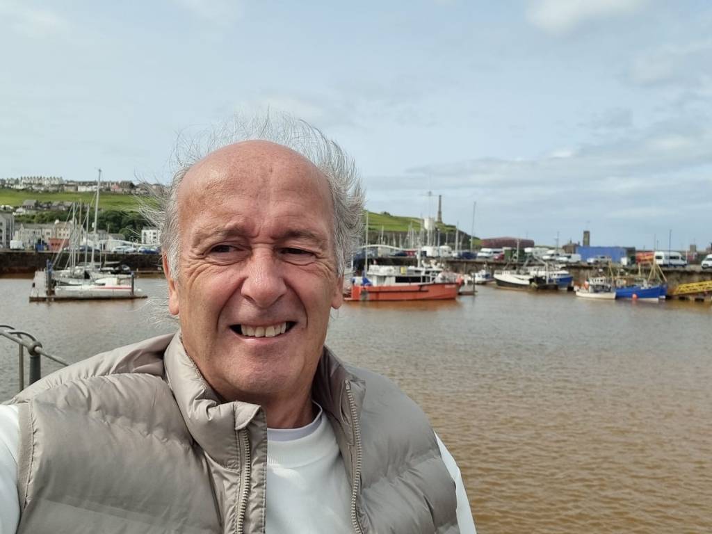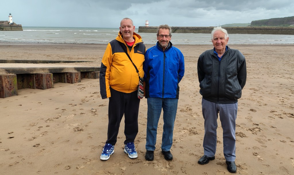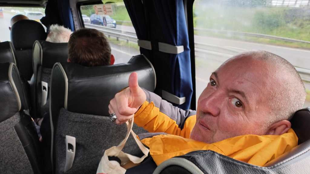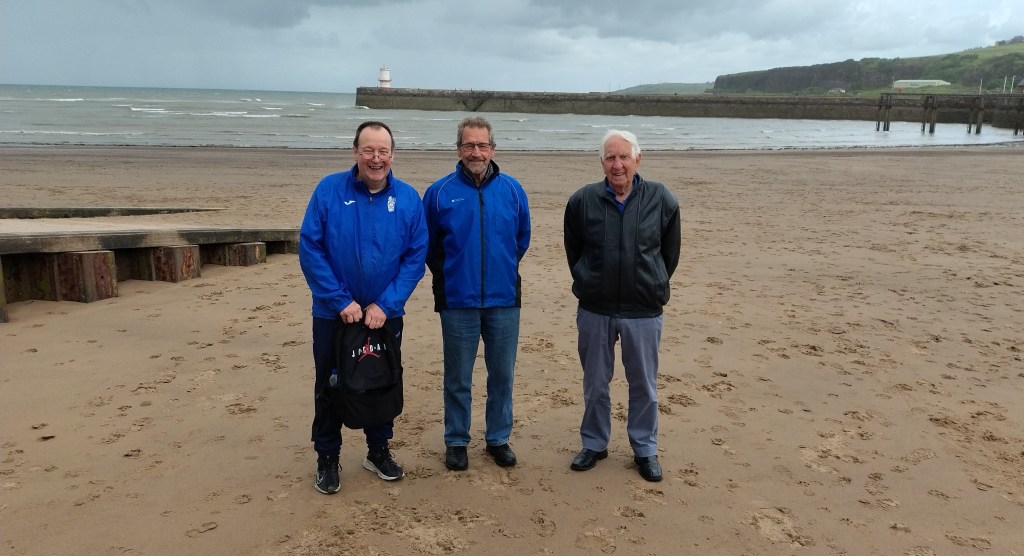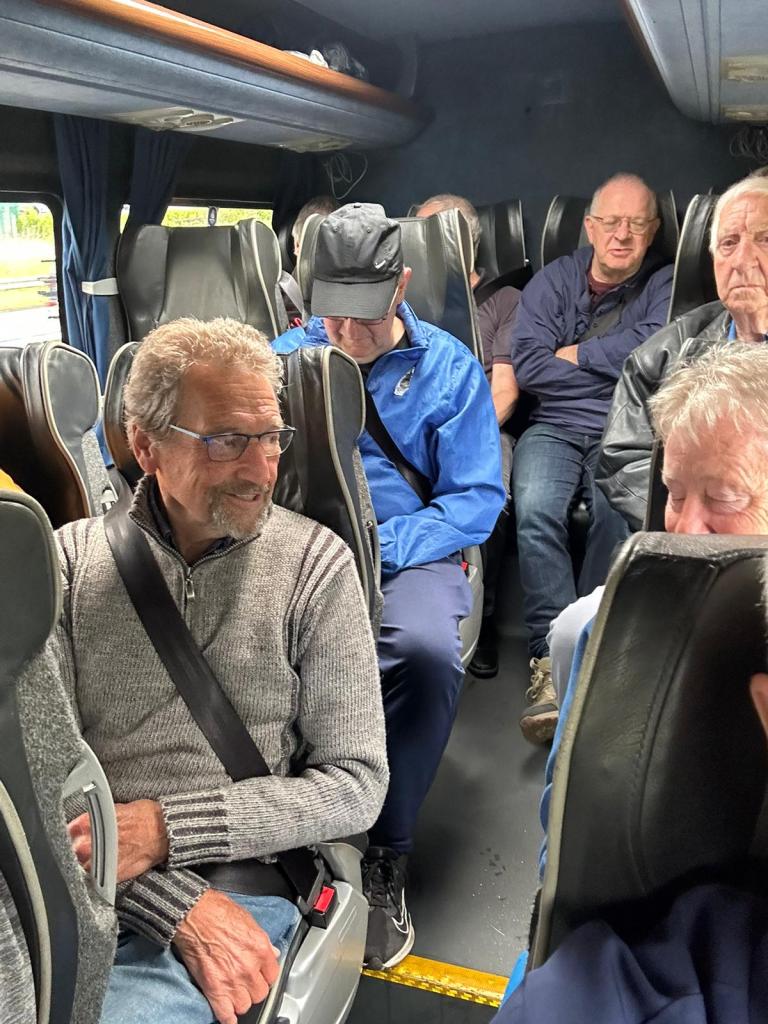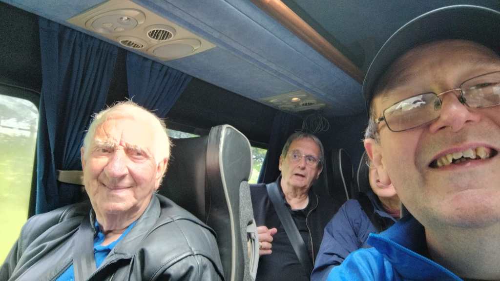 As a consequence, since the Whitehaven lads had made considerable effort to make a long trip to Bury from Whitehaven, we thought we’d return the gesture and take a couple of teams to Whitehaven. Ergo, on the 3rd of June 2025, a combined set of players from Bury Relics and Bury Community Football, took a mini-bus and a car to Whitehaven, which was 17 players in total (15 on the bus, 2 in the car). The outward journey was punctuated by a visit to a very nice service station called Tebay services (I think it’s won awards) for breakfast, which was subsidized by Ramsbottom Rotary (see below). It was an interesting breakfast as I learnt about Cuddy’s Cheese that apparently used to be sold at Tebay, and Dave bought himself a magic carpet. Additionally, following a fuel up of the grey matter, the remaining part of the journey involved a 50-question classic sports quiz. When I was setting it, I was thinking it could be simple for the sporting geniuses that were along on the trip, but I got many groans of this being difficult. From all the teams of 2, it looked like Phil and Dave B, Mark and Keith T (#1028) and Mike and Ian were the favourites. This was emphasized when one of the teams started to brag as they finished while all the other teams were half way through theirs. As it turned out, the said team had missed out the last 2 pages and didn’t win as a result. Phil and Dave B came a commendable 2nd place on 33 points, while Mark E and Keith T (#1028) won with 36 points (well done). Photo shows Keith T (#1028) and myself taking a selfie on the minibus.