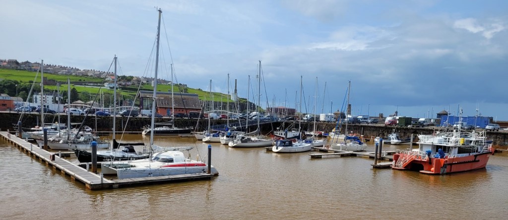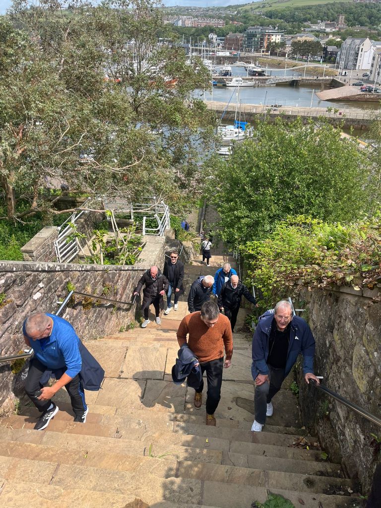 On arrival in Tesco’s Super store in Whitehaven, we were met by Richard, who had kindly planned a tour of Whitehaven Harbour. On reflection, afterwards, we were thinking this was a strategy to tire us out, as it involved climbing a huge stone staircase. It’s not an ideal thing to do, just after 3 hours in a minibus 😊. Anyway, the tour was excellent, with great scenery and an interesting narrative from Richard. Some of us did an alternative walk on a beach, which was also good. Note; if we go back to Whitehaven, we can get a game of beach cricket in, as this beach is close and we could do both football and quick game of cricket. Photos show the harbour and the steep steps Richard made most of us climb.