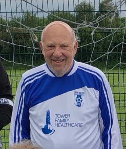 Pat Fitzgerald: In his own words “Started walking football at Bolton then transferred to Bury Relics when they started a team. Joined the Relics in 2017 when numbers were made up by those in Bury Leisure so we could have a match. Played for all the age groups 60’s, 65’s, 70’s and now the 75’s, not that I was any good, just got older!! Managed to play for the England Parkinson’s Disease team in Glasgow (in goal). Played for most teams at Heywood as very often teams were short and I just loved being involved. Enjoy my football and received a 25 year award from the LFA for services to football. Qualified football referee and hockey umpire . Had the privilege to carry the Queens Baton during the 2022 Commonwealth games. Love the chats after games with tea and biscuits.