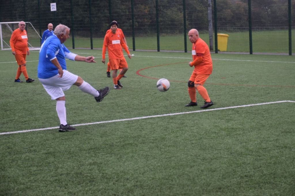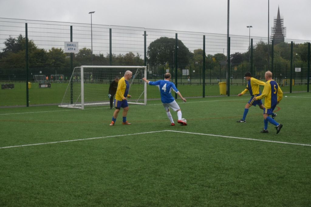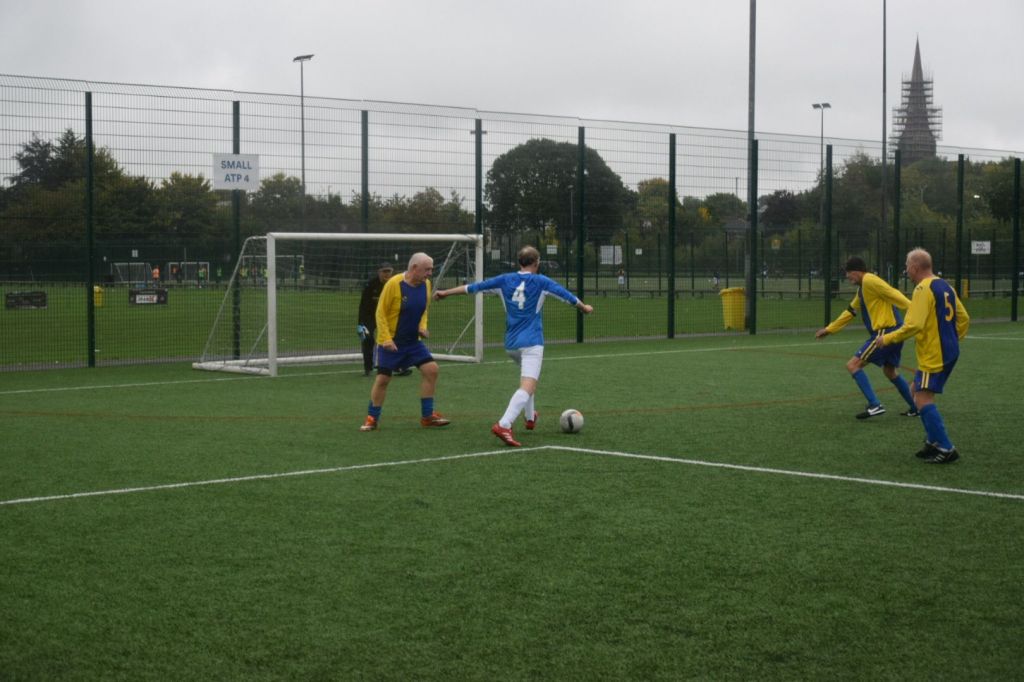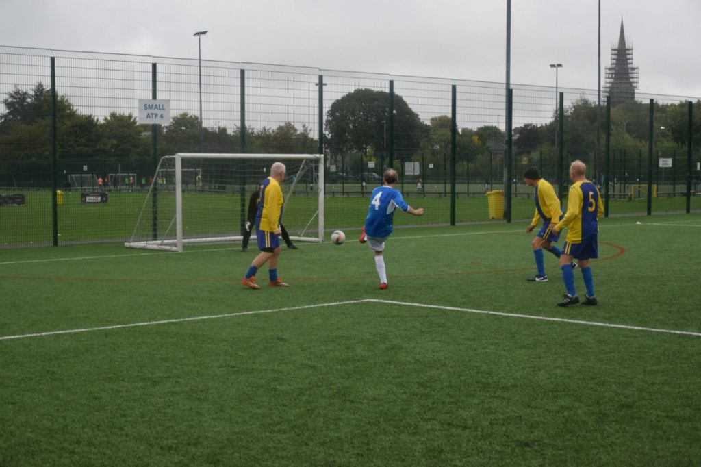 The first game was against Bolton, who looked to be sporting a new bright kit that probably can be seen all the way from Mars. The starting formation was as follows: Graham up-front, Gordon and Ian in the middle, Keith S (The Wall) and Wayne at the back, and Steady Eddy in goal. Duracell Alan as a sub. The no-nonsense Ref gets the first fixture of Bolton underway, and quickly there is an attack from Bolton down the left-hand side, which results in a shot across Eddy’s goal, but wide. Then it’s a good bit of skill by Keith S, on Bury’s left, to skip past his marker and play the ball inside to Graham. Good play but the pass was just too high, and a free-kick. Then, as time elapses, Bolton turn up the heat and start to pressure the Relics but without making any clear shooting chances. This was because the Relics were stout and resolute, not giving Bolton players any opportunity to shoot or space. This culminates in a good block from Wayne, and a head-high free-kick. Bolton play the ball forward to their #10, who for the first time, makes a good turn and gains half a yard; the shot is fortunately wide. Then the Relics have a spell of possession, and a trip on Graham brings a free-kick. The free-kick is played to Graham, who wastes no time in turning and shooting. The ball is heading towards goal, bouncing several times on the way, but it is just millimetres wide past the post. Their keeper was nowhere near covering that, it would have been a great goal. Then, good play again by the Relics, The Wall makes a good interception, and plays the ball to Ian, who then plays a one-two with Graham. However, the return pass to Ian is just too far out of his reach and the ball evades Ian and out for a kick-in. Bolton go back on the attack, and that produces some great defensive work by Wayne, who sticks to their #10 as if he is his shadow. He tries to get away from Wayne, by traversing across the area but Wayne sticks with him, and there is no chance of a shot because of Wayne’s determination. Then, SOLID by the Wall again, blocking a powerful Bolton shot. The ball is played back in to their #10, who Wayne is marshalling again, and #10 tries to back Wayne into the area. Luckily, the Ref is alert to it and gives Relics possession. Then it’s the Relics turn to attack, with passes from Ian to Gordon, then to Graham, and then a shot. On this occasion, the shot is deflected for a kick-in. From the kick-in, Ian receives the ball with his back to goal, on the left, and swivels at pace to quickly shoot. The keeper reacts quickly enough to make a save but it was quick thinking and a good effort by Ian. Bolton reply by getting the ball forward to their #10, who gets a shot away but Eddy is there to save it. Their #10 is a good outlet for Bolton, and he’s having a good battle with Wayne, who again makes a block on a #10 shot. The game concludes with a 0 – 0 draw. This was the first game, so both teams were fresh and cancelled each other out a bit. Both had some half chances but nobody had an absolute clear-cut chance to score. Bolton are a fit and skilled team, so this was a good result for the Relics, who played well themselves.