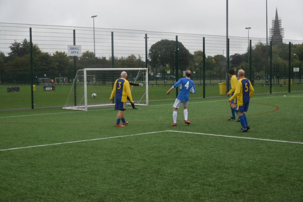 From the kick-off, Bury are quickly on the attack and create a chance to shoot, but it’s ricochets out for a corner. “Oh, I Say! What a great goal!” Ian runs over to take the corner and quickly spots Graham in space on the edge of the area, unmarked. He then swiftly delivers an astute, low and hard corner across the area that is hit first time by Graham. It arrows into the net, past a hapless Blackpool goalkeeper, who had not yet set himself for the corner. Blackpool were completely unprepared for that corner, and Ian and Graham’s quick thinking and execution gave the Relics a 1-0 lead. Blackpool try to immediately reply that starts with an interception by their #7. This gives them an opportunity on the right-hand side and the shot is made, but Eddie’s gets down to save with his feet. It’s a good save, and it looks like he has super and sublime brain capacity as the ball is catapulted at pace, perfectly, to Graham’s feet, as if he had played that on purpose. In any case, it looked great. Then there is a good passage of play that includes passing between Ian, Graham and finally Duracell Alan, who has the space to shoot; he does so and it looks to be heading into the top corner, but it just goes too high and wide. Not a goal but a good effort nonetheless from the industrious Duracell. Head-height freekick and on Blackpool’s next attack, Graham manages to intercept but he is surrounded by Blackpool men, so he passes it back to Eddy but the pace on the pass takes it out for a corner. Bury now show their resilience by not giving a Blackpool 1 inch of room or clear path to goal. However, a Blackpool midfielder works a yard of space, just past the halfway line, and hits a low and powerful shot on the outside of his right foot. The ball whistles past the post at high velocity and it is questionable whether Eddy could have saved that if it was on target; that was a good effort from a long way out. As the Relics regain possession and attack, a shot is deflected and trickles through to their goalkeeper. However, the keeper is not careful enough with his subsequent distribution and only finds Graham with his throw-out. Graham is clean through, one on one with the keeper and tries one of his typical finishes. This involves bamboozling the keeper with a faint, which makes the keeper go to ground, and either dink the ball over the top, or side step the keeper to score into an empty net. On this occasion the dink finish was selected, but unfortunately it was just too close to the keeper. That was close and a good effort by Graham, who’s bright alertness gave him the chance to begin with. And the keeper plays another risky ball out for Blackpool, and Graham uses intricate skill to bring a difficult interception under control; he then passes to Gordon, who expertly lays the ball into the path of an onrushing Wayne, but his first-time shot is sliced out for a kick-in. The subsequent passage of play results in a sucker punch to the Relics. Their big #24 comes on as a sub, and from the kick-in, a ball is played to his feet up-front, with one Relics defender behind him. He’s a big strong lad and uses his strength and long reach to turn wide of his marker and gain half a yard, and to hit a low and powerful shot across Eddy and into the goal. The turn and shot happened in a split second of time and, to be fair, it was a terrific goal for Blackpool. Eddy had no chance. That evened the score at 1-1. Then striker #24 is at it again, but this time Wayne is fully plugged in and switched on, to make a vital block on the strikers shot. Great defending! Bury now pour forward, looking for a winner but it’s Blackpool who turn possession over, and are on the attack with 3 attackers vs. 2 Bury defenders. The Blackpool midfielder selects to play a square ball, to #24 striker in space, who hits a powerful effort, high over Eddy and makes the goal posts look like a tuning fork, from impact reverberation. The Refs gives head height but if a bit lower, it was 2-1 to Blackpool. We were now under the Cosh a bit as this time the #24 striker turns provider and lays it off to a midfielder, who hits a good shot that Eddy is equal to, and makes a good save. Bury lose possession again, and it’s their #24 again, who receives the ball and is faced by Ian. He does not give an inch of space, and blocks the strikers shot; more stern and good defending by the Relics. The final moments see the Relics on the attack, searching for an elusive winner. It begins with a shot from Graham, and Bury winning a head-height free-kick, which sets up a pattern of play. I can picture an alarm clock and Bill Murray waking up; Bury were awarded 4 free-kicks in succession, all for head-height, where the free-kick was laid off and someone would hit a shot, which would be blocked for another head high free-kick and so on. The Ground Hog day ends with a final free-kick that nearly produces a goal. The ball is played back to Graham, who rifles a shot that deflects off a defender again, but this time the direction is low to the keepers right. It’s going in but the Blackpool keeper redeems himself from earlier with an excellent save to his right, palming the ball wide of the post, following an agile dive. Bury were very close to scoring then but for a fantastic save. That was the last action of the day, a good game and probably a fair result of 1-1.