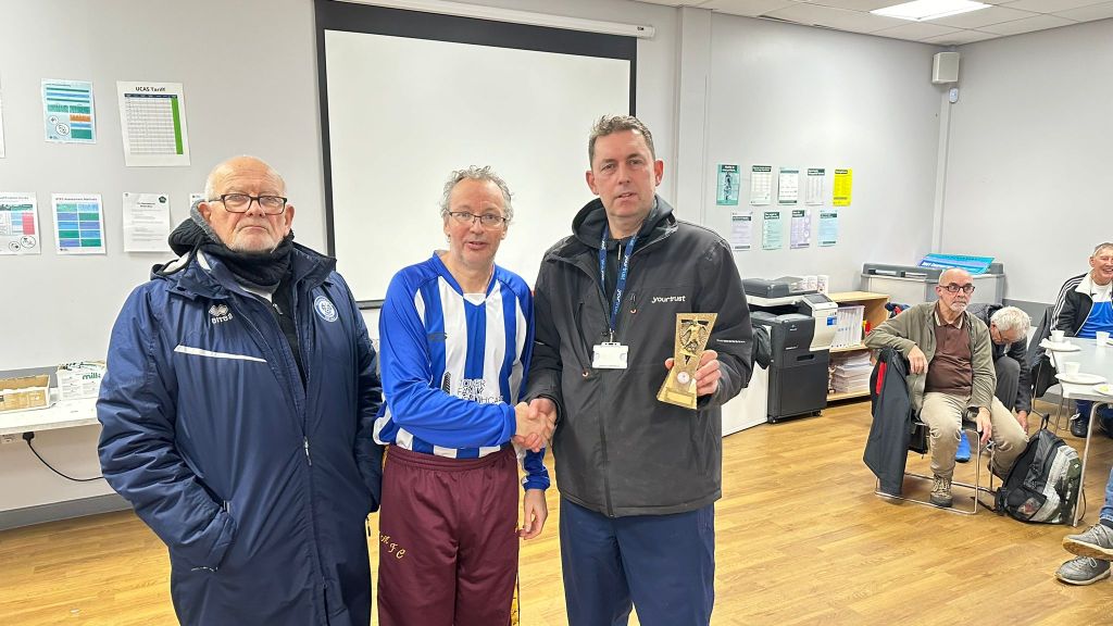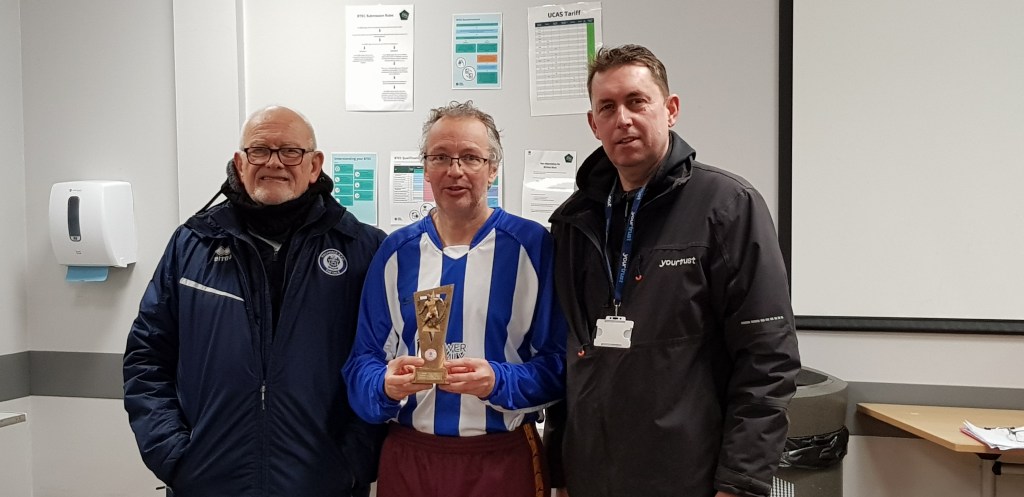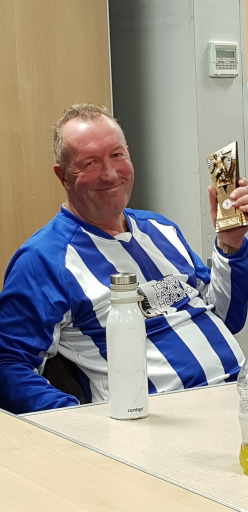 The league wheeled out an abacus and scratched their chins for a while, and…… it was official, Bury Relics Stripes had managed to finish runners up by a superior goal difference. Congratulations Stripes, that is a great result and steady progress. There is a good spirit around this team and on the day, played really well against Bolton and Ribble. Against Wakefield, it was Eddy’s amazing form that kept Relics in contention with a series of good saves. “Mitoma” Mike B nearly scored a great goal by tip-toing past 4 of the champions Ribble team (made them look like Chumpions) and just for the goalie to save his shot. Motherwell Ian’s strategy of getting into an argument to gain open position was brilliant, and again his shot was saved. Andy van R’s supreme confidence of playing his penalty against a post on purpose, which was really a pass-back to Mark T. He started the goal-scoring move of 7 passes, culminating in Motherwell Ian laying on a pass for the waiting Andy to shuffle his feet and score with a low finish. Great move and goal. The comedy moment has to go to the Bolton defender who when diving to the floor, had to somehow do some Twister contortions to prevent any part of his body from entering the area. All these events are in the videos above. Well-done Stripes; listen to the applause as the captain picks up the trophy (click-here).